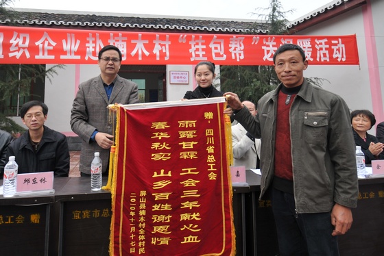 在村留守人员活动中心院坝举行省总工会组织企业捐赠“挂包帮”送温暖仪式。胥纯在讲话中表示,省总工会将对该村的基础建设、生产增收、村民就医、子女上学加大帮扶力度,为楠木村办实事、解难事、做好事。邱东林致词对省总工会表示感谢。省总工会慰问组转交了省煤田地质工程勘察设计研究所、国电大渡河流域水电开发公司工会、成都铁路局工会,捐赠楠木村的送温暖资金4万元。省总工会还为屏山县综治办、屏山县总工会分别赠送了一台电脑,为楠木村村民赠送了法律法规手册、年画和印制有劳动合同法及维权常识、标准省总工会法律援助中心电话的扑克牌。村民代表向省总工会赠送了一面书写着“雨露甘霖,工会三年献爱心。春华秋实,山乡百姓谢恩情”的锦旗。