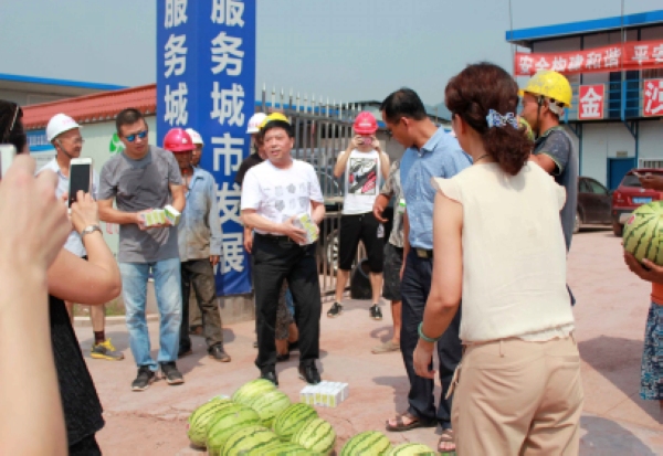 7月21日,顶着炎炎烈日,公司党委书记、董事长余维金,党委副书记、纪委书记、工会主席华毅,党委委员、副总经理黄宾,纪委副书记、监审部部长曾立奇,工会副主席尹红,工程部部长何东等一行组成慰问组,先后对南部新区七星城基础设施建设项目(金沙江大道、南丝绸路、南二路、南四路)、宜宾市廉洁教育基地、市民中心项目群、残疾人康复中心施工现场开展“送清凉”慰问活动。慰问组一行深入施工一线,将西瓜、人丹、藿香正气水等防暑用品亲自送到奋战在一线的参建人员手中,并和他们亲切交谈,详细了解他们的工作、生活和健康情况,叮嘱大家一定要确保人生安全、劳动安全,将丝丝清凉与关爱送给一线参建人员。